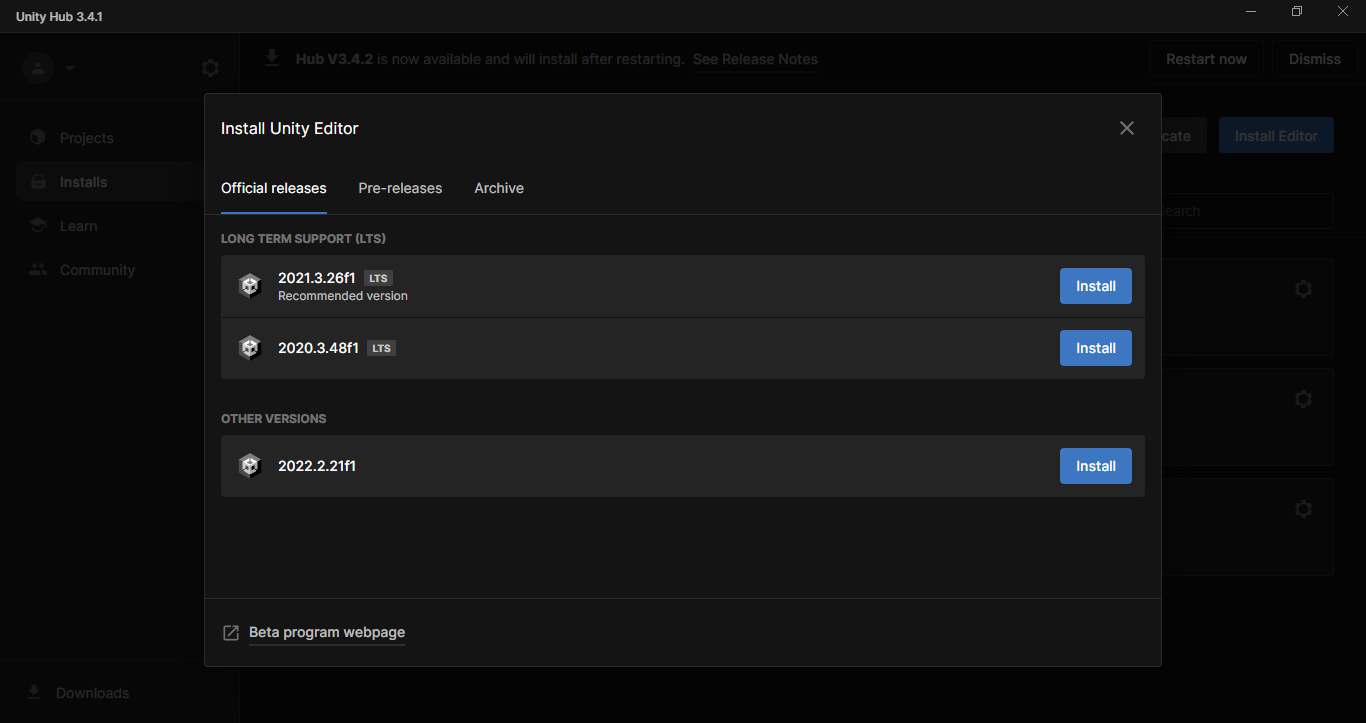 Let's use a Unity project for this. If you have never used it, download and install Unity Hub. After installation, open the program and go to Installs in the left corner, here you can manage your unity installations of different versions.